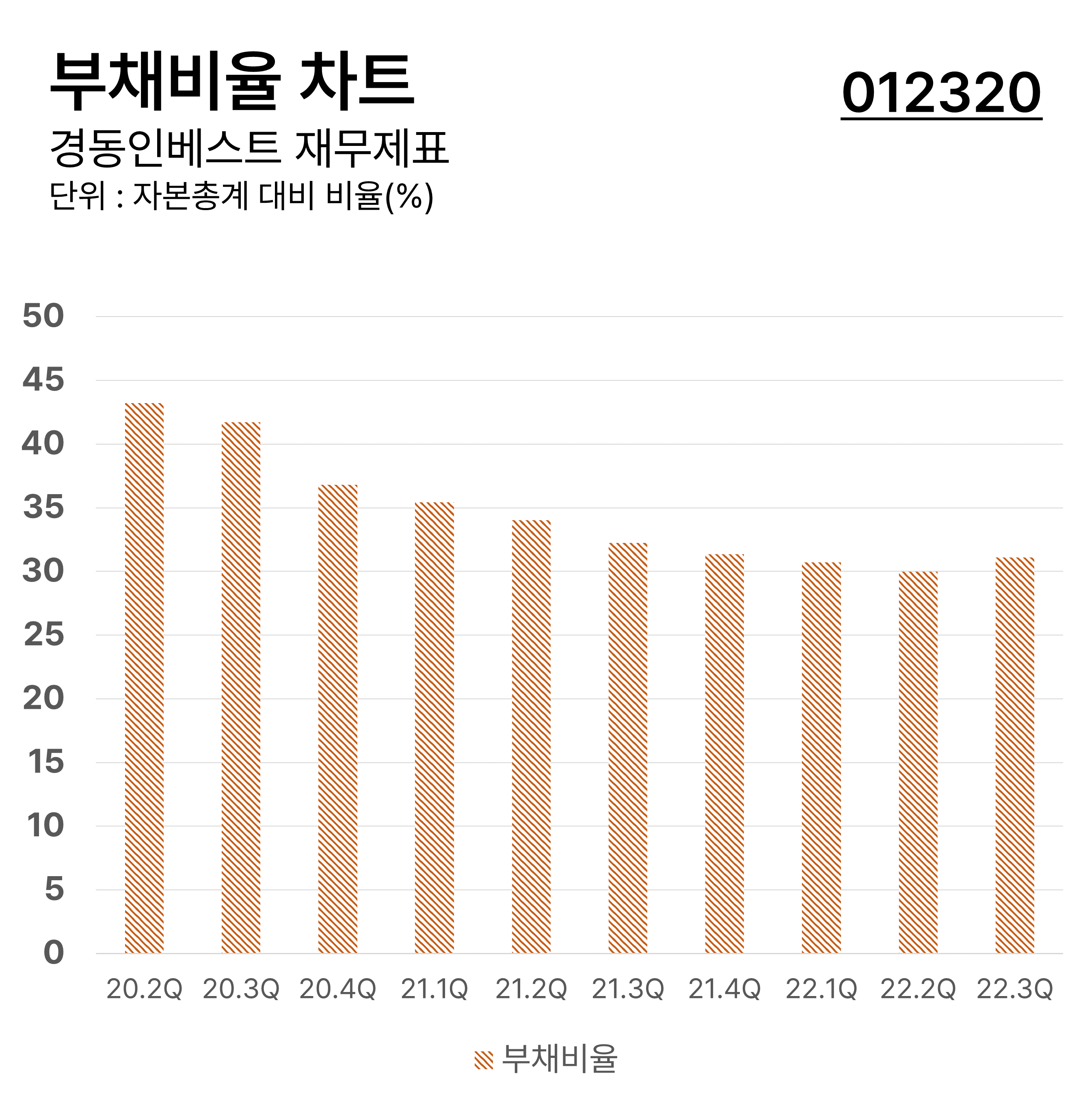 ๊ฒฝ๋์ธ๋ฒ ์คํธ์ ๋ถ๊ธฐ๋ณ ๋ถ์ฑ๋น์จ ์ฐจํธ์ ๋๋ค. ๋ถ์ฑ๋น์จ์ ๊ธฐ์ ์ ๋ณด์ ์์ฐ ์ค ๋ถ์ฑ๊ฐ ์ด๋ ์ ๋ ์ฐจ์งํ๊ณ ์๋๊ฐ๋ฅผ ๋ํ๋ด๋ ๋น์จ๋ก์ ๊ธฐ์ ์ ์ฌ๋ฌด๊ตฌ์กฐ, ํนํ ํ์ธ์๋ณธ ์์กด๋๋ฅผ ๋ํ๋ด๋ ๋ํ์ ์ธ ๊ฒฝ์์งํ์ ๋๋ค. ๋ถ์ฑ๋น์จ์ ์๊ธฐ์๋ณธ ๋๋น ํ์ธ์๋ณธ ๋น์จ๋ก ์ฐ์ถํฉ๋๋ค. ์ต๊ทผ ๊ฒฝ๋์ธ๋ฒ ์คํธ์ ๋ถ์ฑ๋น์จ์ ํ๋ฝ ์ถ์ธ์ ๋๋ค.