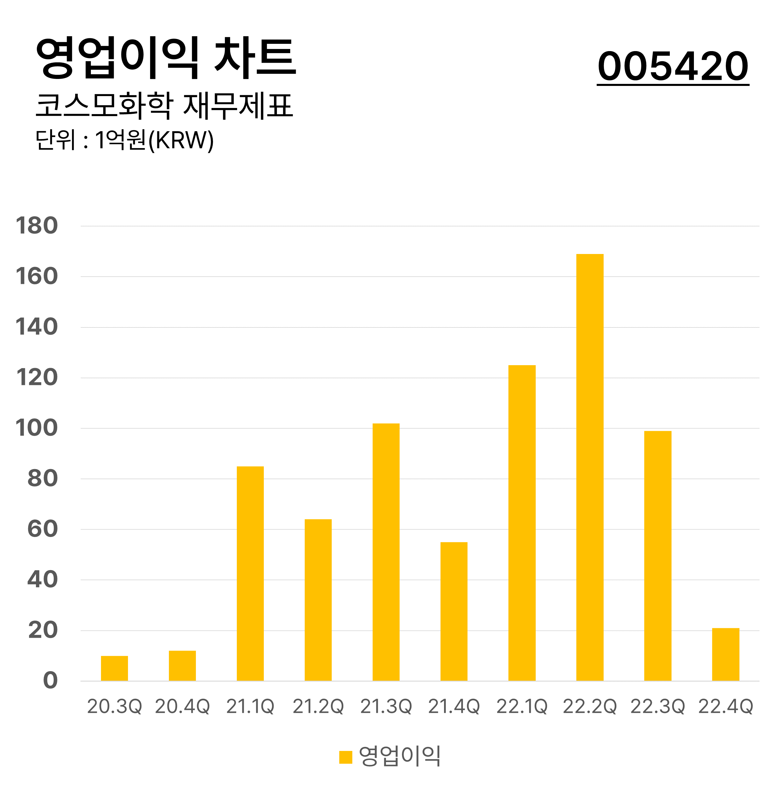 ์ฝ์ค๋ชจํํ์ ๋ถ๊ธฐ๋ณ ์์ด์ต ์ฐจํธ์ด๋ฉฐ 2022๋ 2๋ถ๊ธฐ์ ์ต๋ ์์ด์ต์ ๊ธฐ๋กํฉ๋๋ค. ์์ด์ต์ ์ต๊ทผ ๋ณดํฉ ์ถ์ธ์ ๋๋ค.
