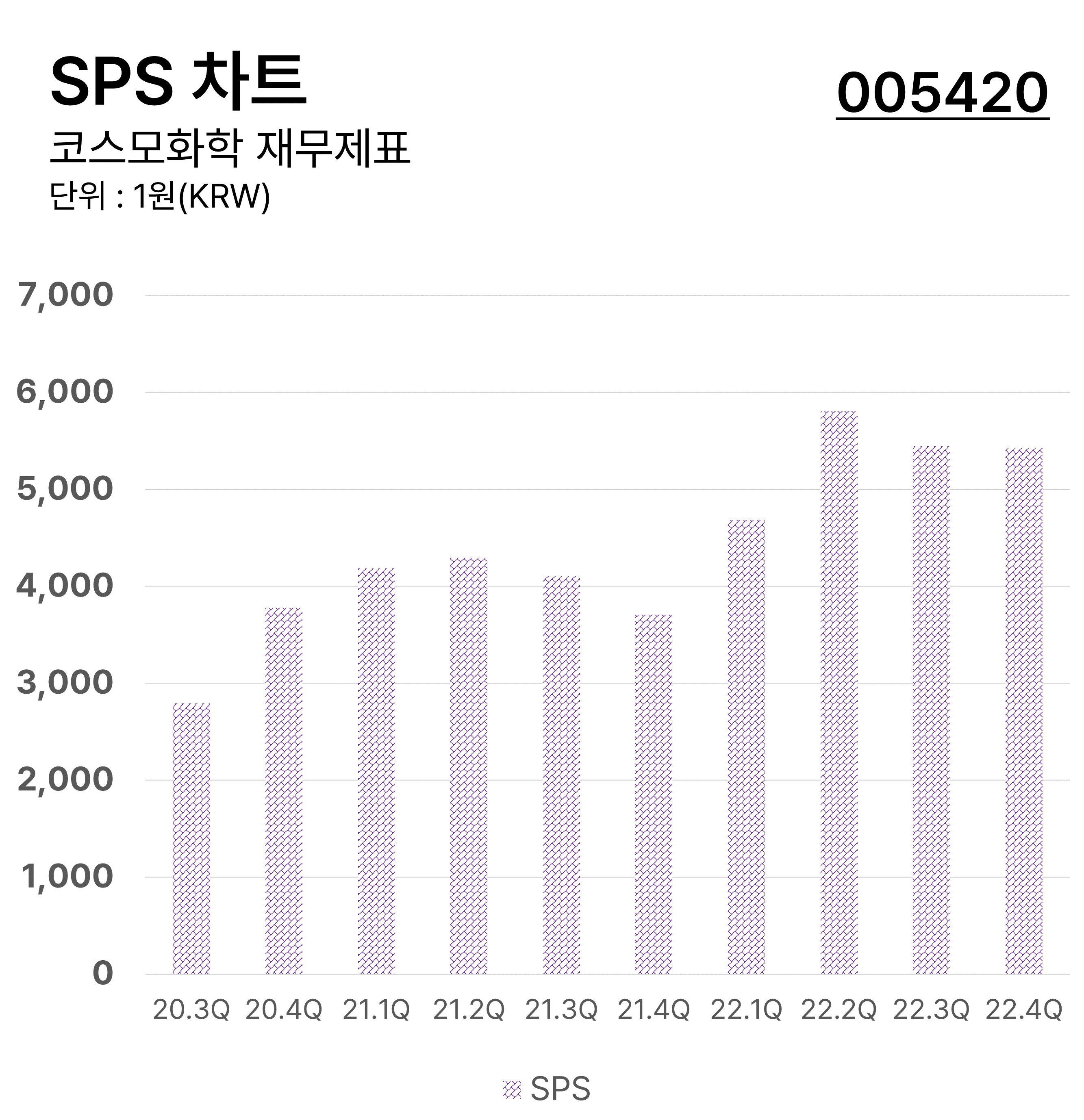 ์ฝ์ค๋ชจํํ์ ๋ถ๊ธฐ๋ณ SPS ์ฐจํธ์ ๋๋ค. ์ฃผ๋น๋งค์ถ์ก(SPS)์ ๋งค์ถ์ก์ ์ ์ฒด ๋ฐํ ์ฃผ์ ์๋ก ๋๋ ์งํ์ด๋ฉฐ ์ฝ๊ฒ ๋งํด์ ์ฃผ์ 1์ฃผ๋น ๊ธฐ์ ์ ๋งค์ถ์ก์ ๊ณ์ฐํ ์งํ์ ๋๋ค.