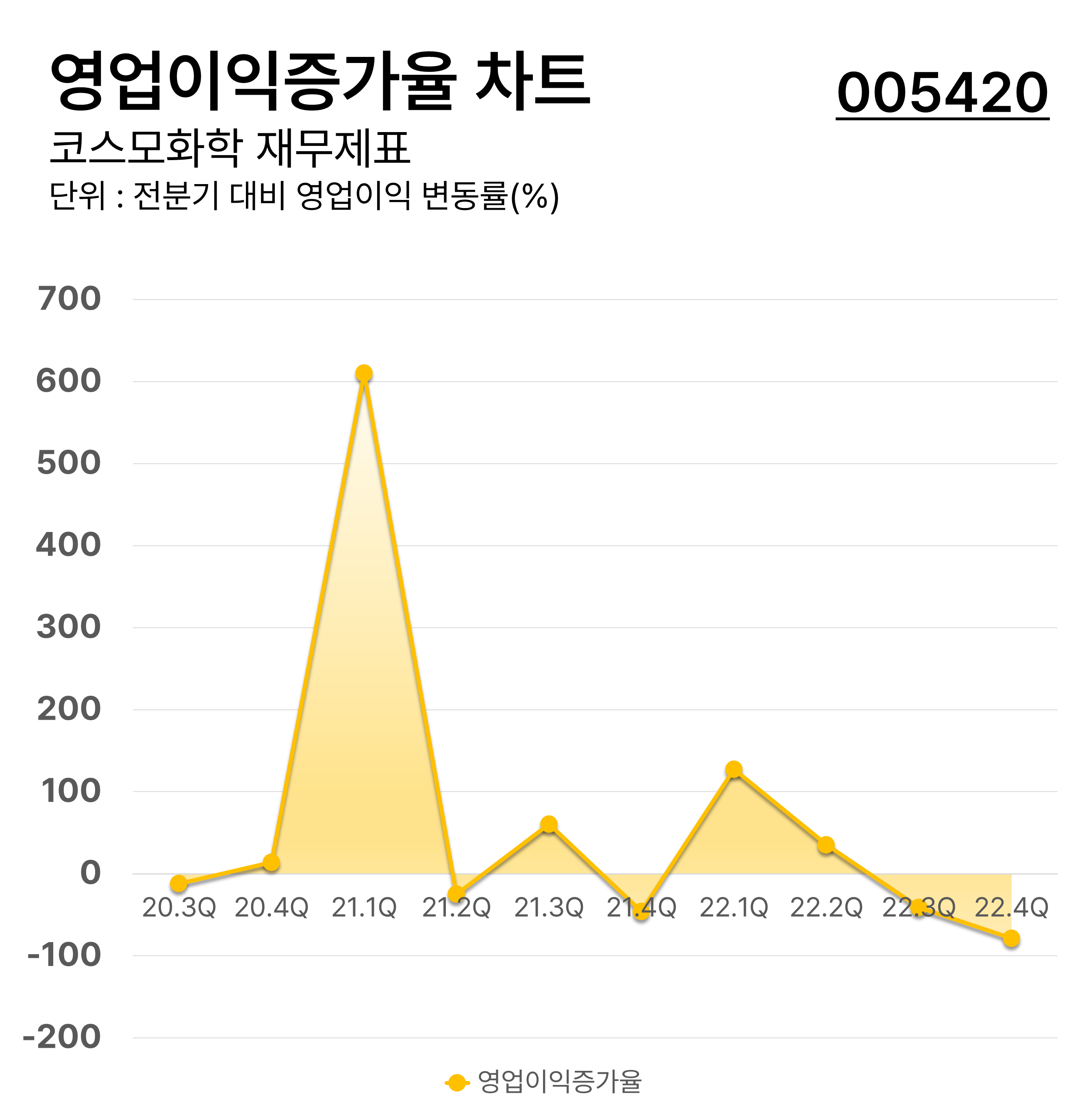 ์ฝ์ค๋ชจํํ์ ๋ถ๊ธฐ๋ณ ์์ ์ด์ต๋ฅ ์ฐจํธ์ด๋ฉฐ 2021๋ 1๋ถ๊ธฐ์ ์ต๋ ์์ ์ด์ต์ฆ๊ฐ์จ์ ๊ธฐ๋กํฉ๋๋ค. ์์ ์ด์ต์ฆ๊ฐ์จ์ด ๋ฎ์๋ ์์ ์ด์ต ์์ฒด๊ฐ ๋๋ค๋ฉด ๊ธฐ์ ์ ํฌ์๊ฐ์น์ ํฐ ์ํฅ์ด ์์ต๋๋ค. ์ฝ์ค๋ชจํํ์ ์์ ์ด์ต์ฆ๊ฐ์จ์ ์ต๊ทผ ๋ฎ์์ง ์ถ์ธ์ ๋๋ค.