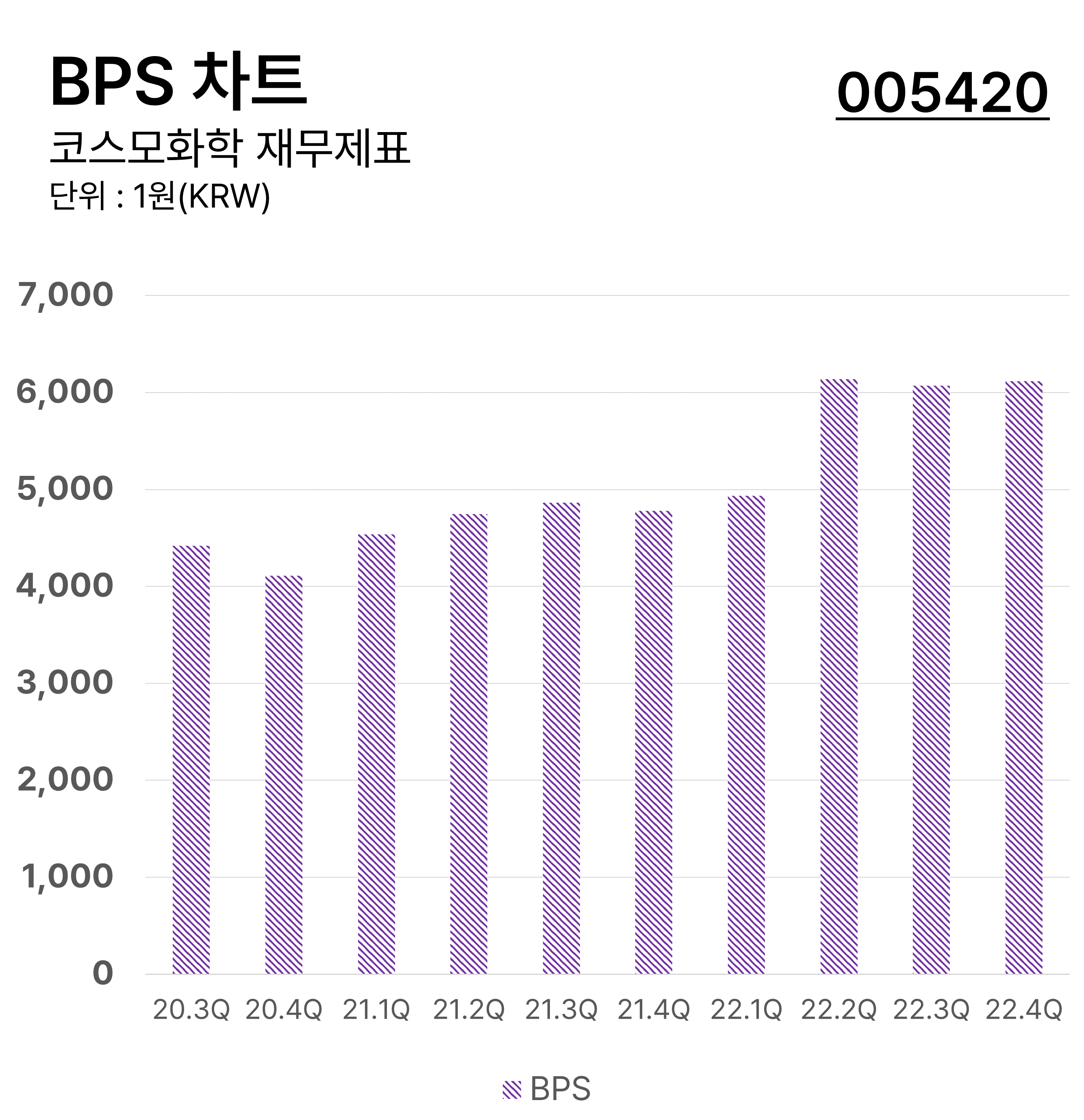 ์ฝ์ค๋ชจํํ์ ๋ถ๊ธฐ๋ณ BPS ์ฐจํธ์ ๋๋ค. ์ฃผ๋น์์์ฐ(BPS)์ ๊ธฐ์ ์ ์๊ธฐ์๋ณธ์ ๋ฐํ ์ฃผ์ ์๋ก ๋๋ ์งํ์ด๋ฉฐ ์ฝ๊ฒ ๋งํด์ ์ฃผ์ 1์ฃผ๋น ๊ธฐ์ ์ด ๋ณด์ ํ ์๋ณธ์ ๊ณ์ฐํ ์งํ์ ๋๋ค.