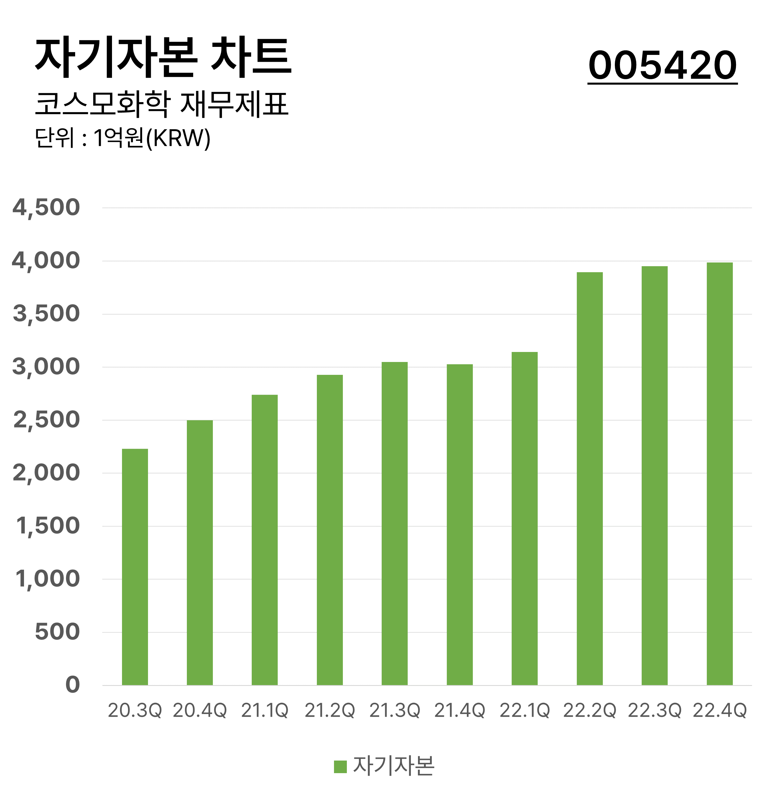 ์ฝ์ค๋ชจํํ์ ๋ถ๊ธฐ๋ณ ์๊ธฐ์๋ณธ ์ฐจํธ์ ๋๋ค. ์๊ธฐ์๋ณธ์ ๊ธฐ์ ์ ์ด์๋ณธ์์ ๋ถ์ฑ๋ฅผ ๋บ ๊ธ์ก์ ๋ปํ๋ฉฐ ๋ฏธ๋ ์ผ์ ์์ ์ ์ํํด์ผ ํ ์๋ฌด๊ฐ ์๋ ๊ธฐ์ ๊ณ ์ ์ ์ฌ์ฐ์ ๋๋ค. ์ฝ์ค๋ชจํํ์ ์๊ธฐ์๋ณธ์ ์ต๊ทผ ์์น ์ถ์ธ์ ๋๋ค.