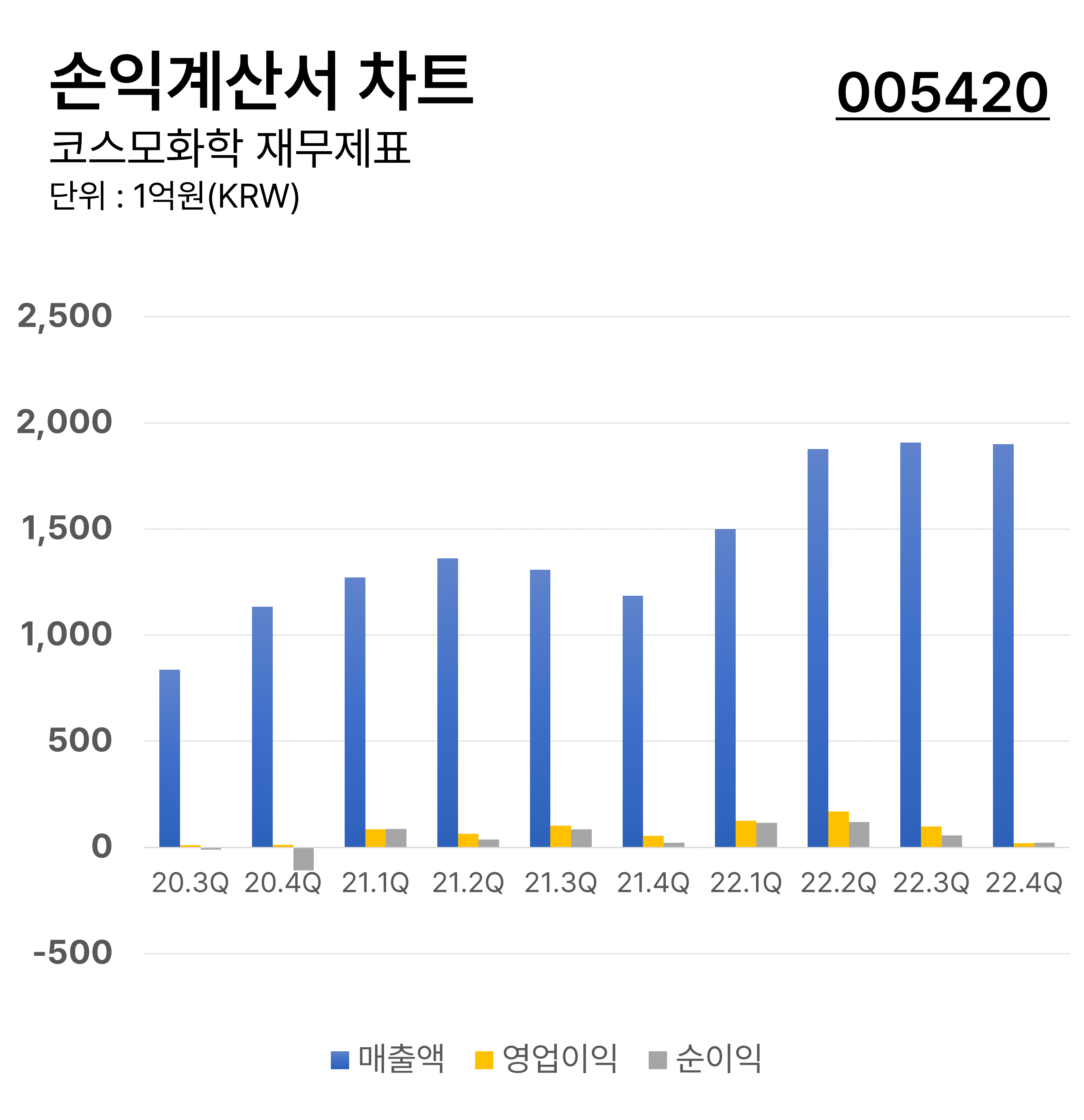 ์ฝ์ค๋ชจํํ์ ์ต๊ทผ ๋ถ๊ธฐ๋ณ ์์ต๊ณ์ฐ์ ์ฐจํธ์ด๋ฉฐ ๋งค์ถ์ก, ์์ ์ด์ต, ์์ด์ต์ ๊ดํ ์งํ์ ๋๋ค. ๋งค์ถ์ก๊ณผ ์์ ์ต, ์์ต ๊ฐ์ ์์น๋ฅผ ์ฝ๊ฒ ๋น๊ต ๊ฐ๋ฅํ๋ฏ๋ก ํฌ์์ ํฐ ๋์์ ์ค ์ ์์ต๋๋ค. ์์ ์ด์ต ์ค ๊ฐ์ข ๋น์ฉ๊ณผ ๋ฉ๋ถํ ์ธ๊ธ์ ์ ์ธํ๊ณ ํ์ฌ๊ฐ ์ค์ ๋ก ๋จ๊ธด ์ด์ต์ ์์ด์ต์ผ๋ก ๋ถ๋ฆ ๋๋ค.