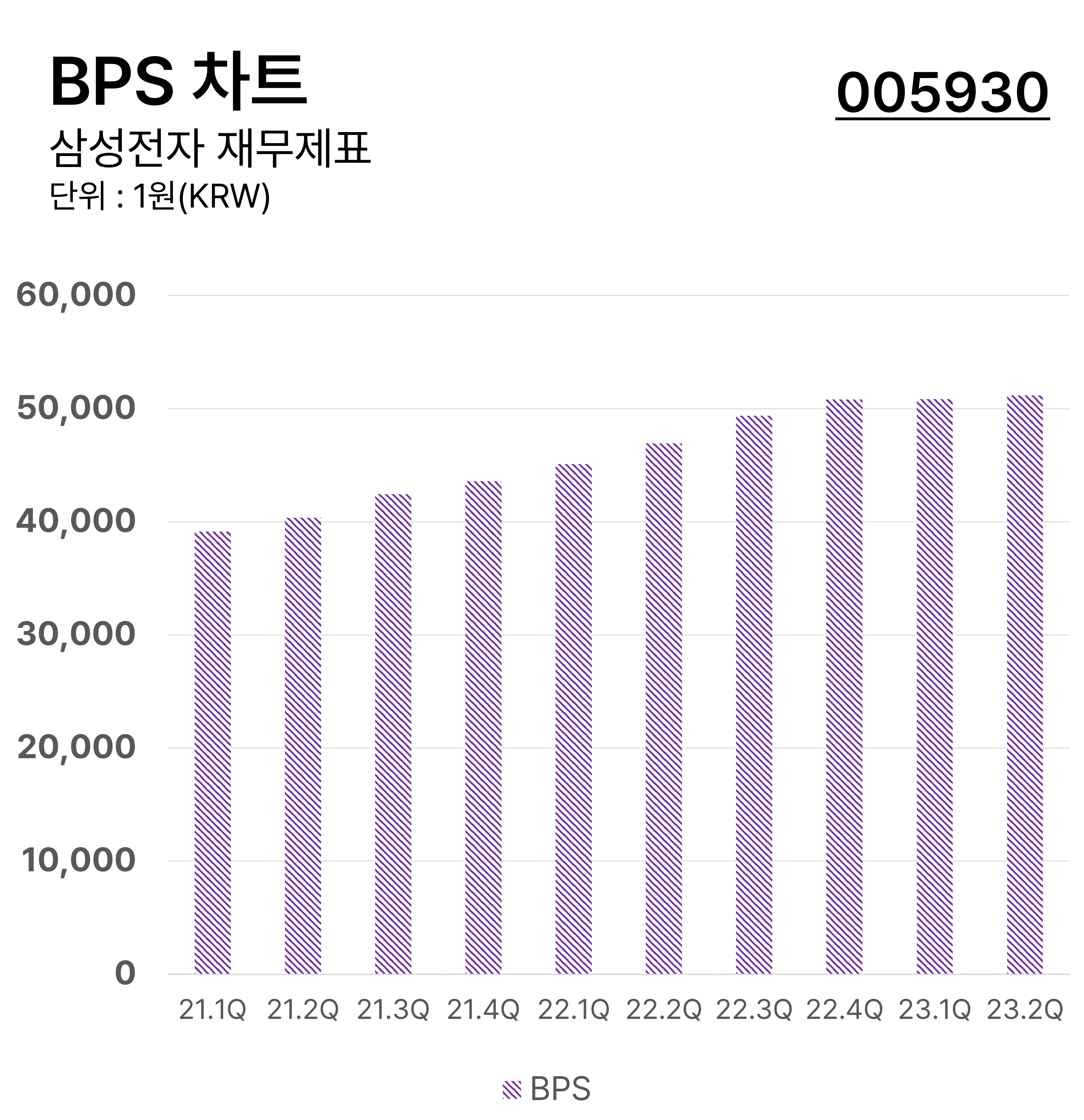 ์ผ์ฑ์ ์์ ๋ถ๊ธฐ๋ณ BPS ์ฐจํธ์ ๋๋ค. ์ฃผ๋น์์์ฐ(BPS)์ ๊ธฐ์ ์ ์๊ธฐ์๋ณธ์ ๋ฐํ ์ฃผ์ ์๋ก ๋๋ ์งํ์ด๋ฉฐ ์ฝ๊ฒ ๋งํด์ ์ฃผ์ 1์ฃผ๋น ๊ธฐ์ ์ด ๋ณด์ ํ ์๋ณธ์ ๊ณ์ฐํ ์งํ์ ๋๋ค.