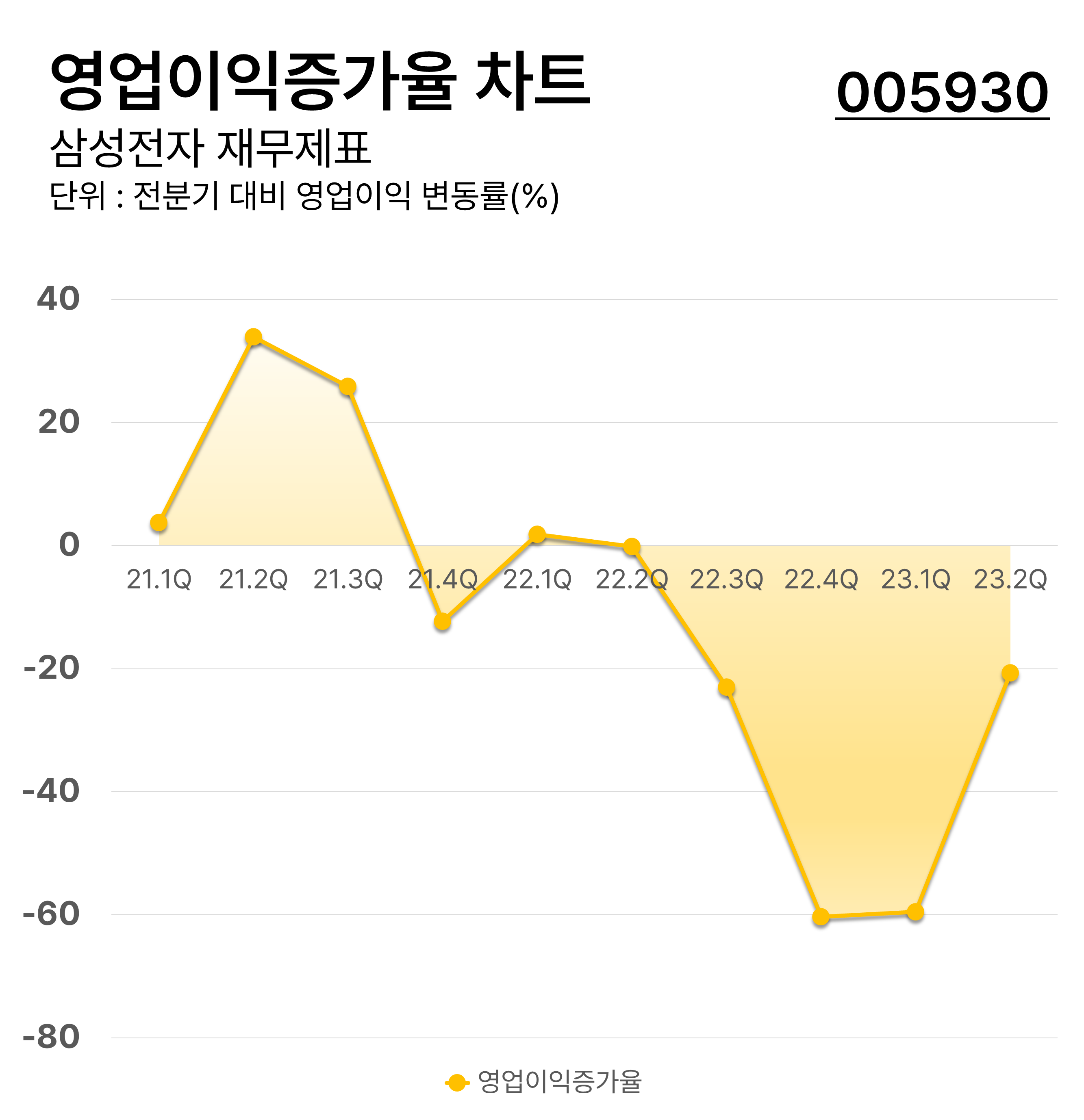 ์ผ์ฑ์ ์์ ๋ถ๊ธฐ๋ณ ์์ ์ด์ต๋ฅ ์ฐจํธ์ด๋ฉฐ 2021๋ 2๋ถ๊ธฐ์ ์ต๋ ์์ ์ด์ต์ฆ๊ฐ์จ์ ๊ธฐ๋กํฉ๋๋ค. ์์ ์ด์ต์ฆ๊ฐ์จ์ด ๋ฎ์๋ ์์ ์ด์ต ์์ฒด๊ฐ ๋๋ค๋ฉด ๊ธฐ์ ์ ํฌ์๊ฐ์น์ ํฐ ์ํฅ์ด ์์ต๋๋ค. ์ผ์ฑ์ ์์ ์์ ์ด์ต์ฆ๊ฐ์จ์ ์ต๊ทผ ๋ฎ์์ง ์ถ์ธ์ ๋๋ค.