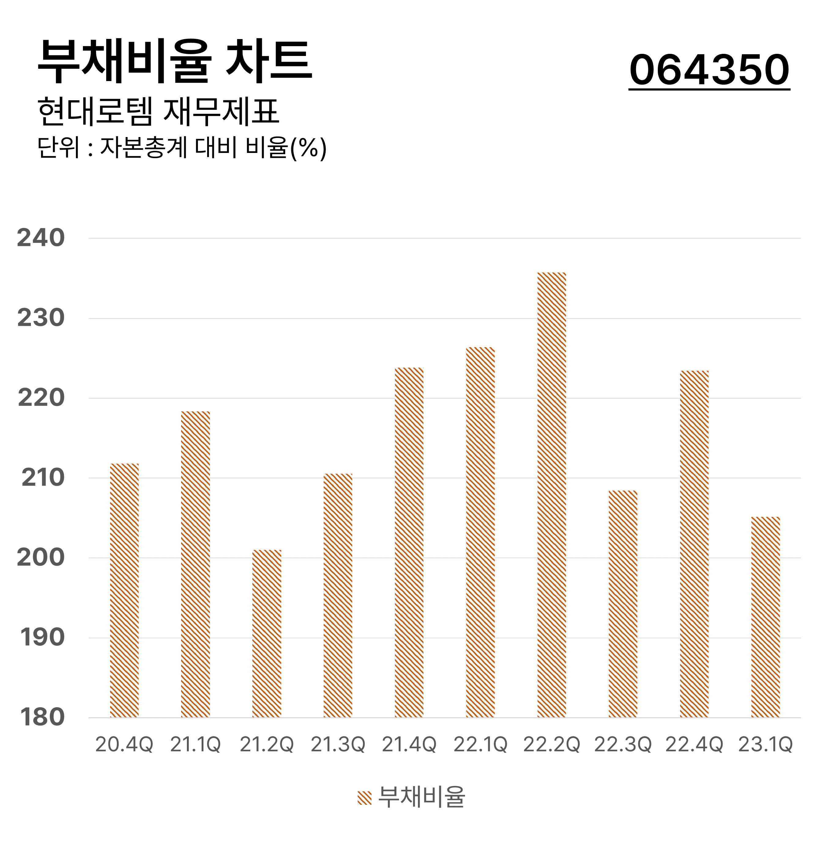 ํ๋๋กํ ์ ๋ถ๊ธฐ๋ณ ๋ถ์ฑ๋น์จ ์ฐจํธ์ ๋๋ค. ๋ถ์ฑ๋น์จ์ ๊ธฐ์ ์ ๋ณด์ ์์ฐ ์ค ๋ถ์ฑ๊ฐ ์ด๋ ์ ๋ ์ฐจ์งํ๊ณ ์๋๊ฐ๋ฅผ ๋ํ๋ด๋ ๋น์จ๋ก์ ๊ธฐ์ ์ ์ฌ๋ฌด๊ตฌ์กฐ, ํนํ ํ์ธ์๋ณธ ์์กด๋๋ฅผ ๋ํ๋ด๋ ๋ํ์ ์ธ ๊ฒฝ์์งํ์ ๋๋ค. ๋ถ์ฑ๋น์จ์ ์๊ธฐ์๋ณธ ๋๋น ํ์ธ์๋ณธ ๋น์จ๋ก ์ฐ์ถํฉ๋๋ค. ์ต๊ทผ ํ๋๋กํ ์ ๋ถ์ฑ๋น์จ์ 2022๋ 2๋ถ๊ธฐ์ ์ต๋ ๋น์จ์ ๊ธฐ๋กํฉ๋๋ค.