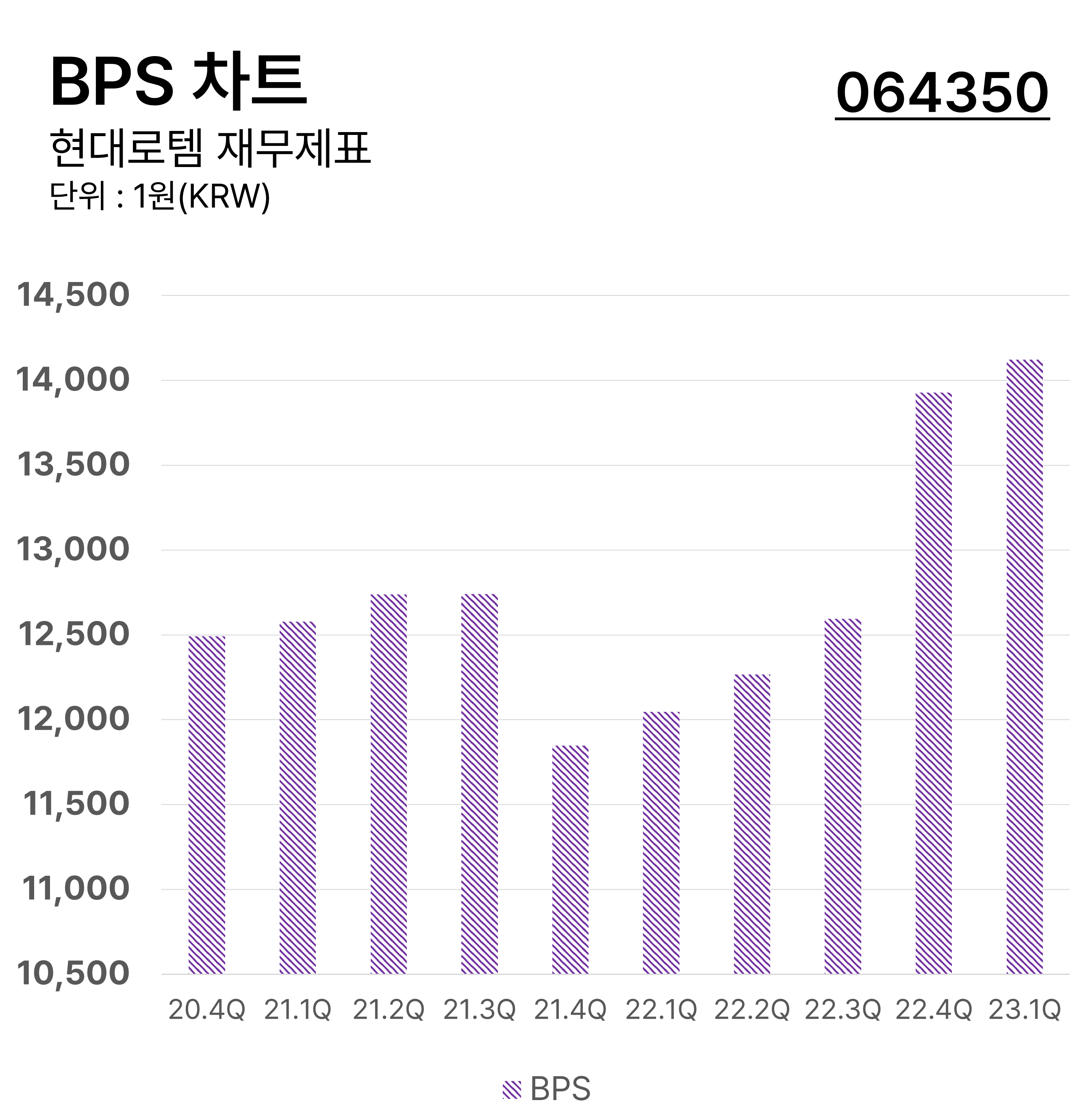 ํ๋๋กํ ์ ๋ถ๊ธฐ๋ณ BPS ์ฐจํธ์ ๋๋ค. ์ฃผ๋น์์์ฐ(BPS)์ ๊ธฐ์ ์ ์๊ธฐ์๋ณธ์ ๋ฐํ ์ฃผ์ ์๋ก ๋๋ ์งํ์ด๋ฉฐ ์ฝ๊ฒ ๋งํด์ ์ฃผ์ 1์ฃผ๋น ๊ธฐ์ ์ด ๋ณด์ ํ ์๋ณธ์ ๊ณ์ฐํ ์งํ์ ๋๋ค.
