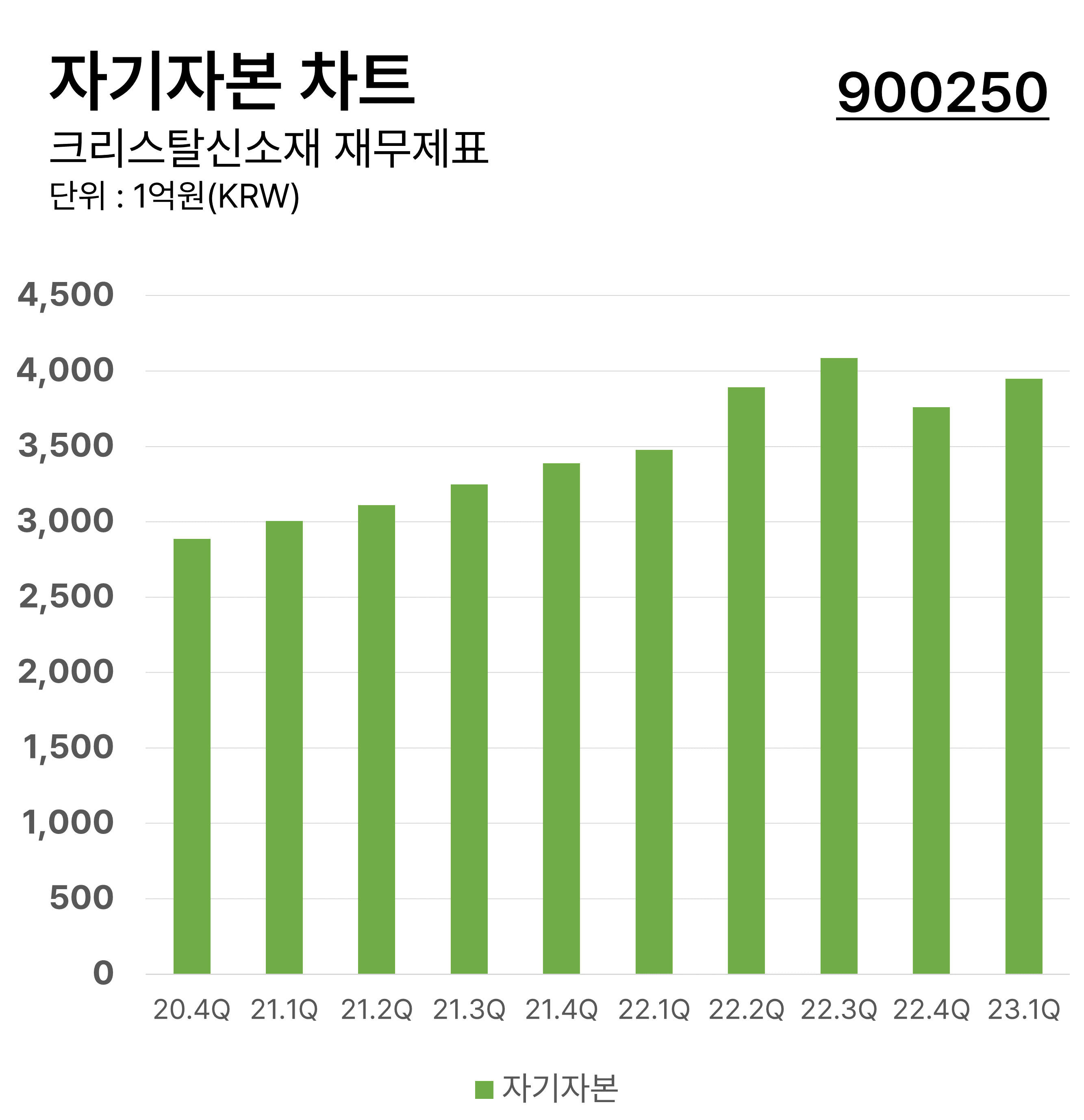 ํฌ๋ฆฌ์คํ์ ์์ฌ์ ๋ถ๊ธฐ๋ณ ์๊ธฐ์๋ณธ ์ฐจํธ์ ๋๋ค. ์๊ธฐ์๋ณธ์ ๊ธฐ์ ์ ์ด์๋ณธ์์ ๋ถ์ฑ๋ฅผ ๋บ ๊ธ์ก์ ๋ปํ๋ฉฐ ๋ฏธ๋ ์ผ์ ์์ ์ ์ํํด์ผ ํ ์๋ฌด๊ฐ ์๋ ๊ธฐ์ ๊ณ ์ ์ ์ฌ์ฐ์ ๋๋ค. ํฌ๋ฆฌ์คํ์ ์์ฌ์ ์๊ธฐ์๋ณธ์ 2022๋ 3๋ถ๊ธฐ์ ์ต๋ ์์น๋ฅผ ๊ธฐ๋กํ๊ฒ ๋ฉ๋๋ค.