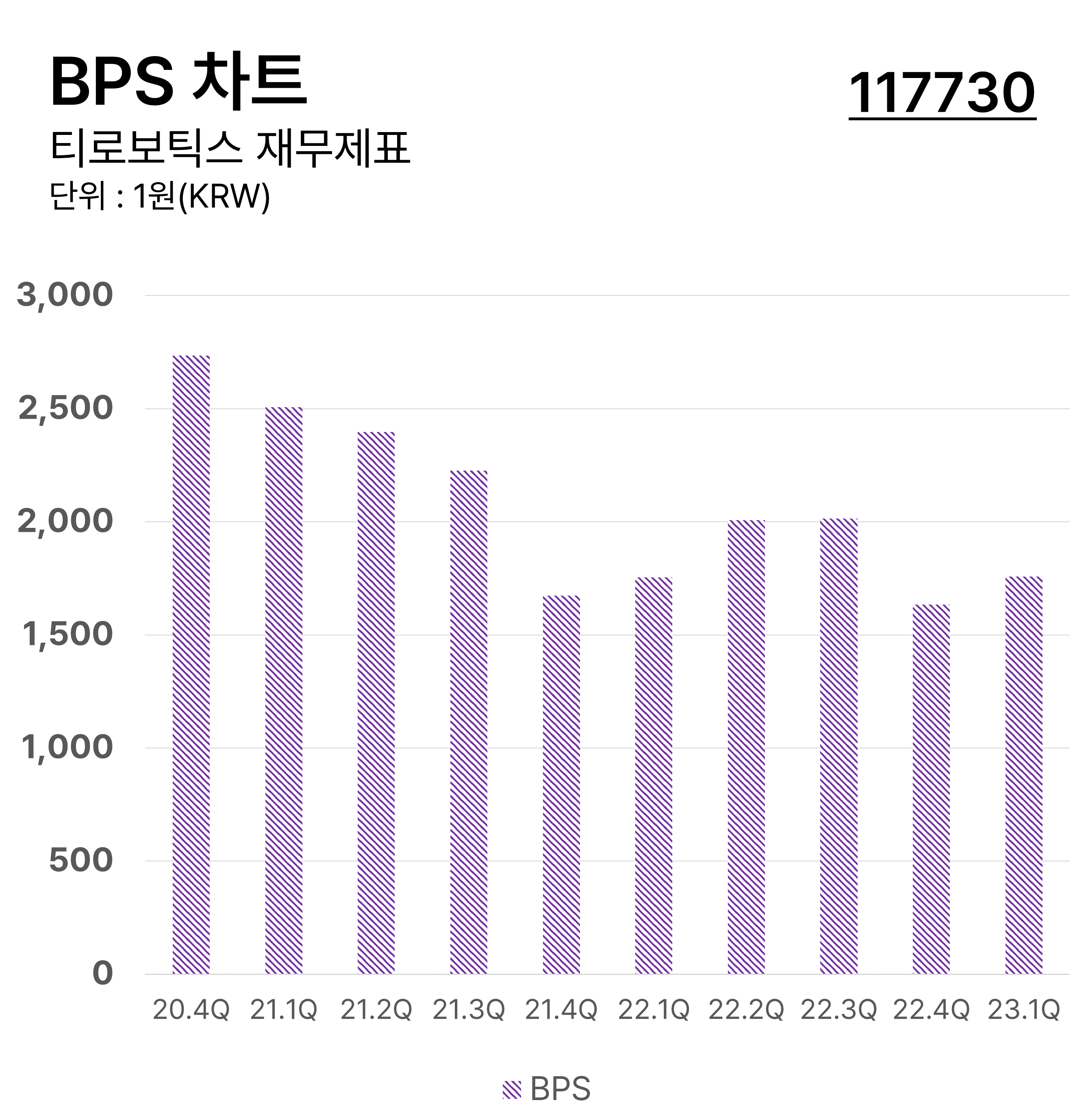 ํฐ๋ก๋ณดํฑ์ค์ ๋ถ๊ธฐ๋ณ BPS ์ฐจํธ์ ๋๋ค. ์ฃผ๋น์์์ฐ(BPS)์ ๊ธฐ์ ์ ์๊ธฐ์๋ณธ์ ๋ฐํ ์ฃผ์ ์๋ก ๋๋ ์งํ์ด๋ฉฐ ์ฝ๊ฒ ๋งํด์ ์ฃผ์ 1์ฃผ๋น ๊ธฐ์ ์ด ๋ณด์ ํ ์๋ณธ์ ๊ณ์ฐํ ์งํ์ ๋๋ค.