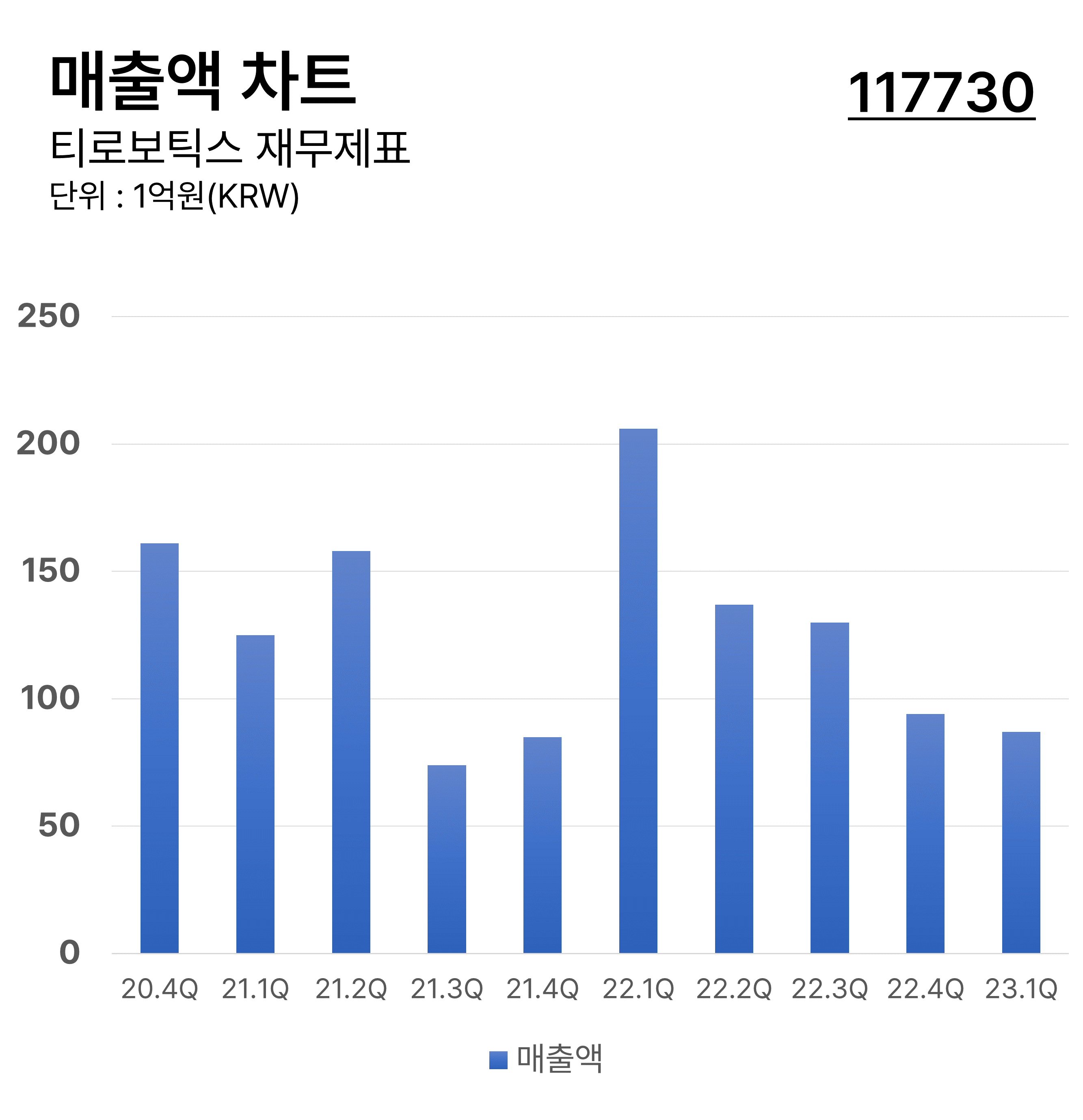 ํฐ๋ก๋ณดํฑ์ค์ ๋ถ๊ธฐ๋ณ ๋งค์ถ์ก ์ฐจํธ์ด๋ฉฐ 2022๋ 1๋ถ๊ธฐ์ ์ต๋ ๋งค์ถ์ก์ ๋ฌ์ฑํ์ต๋๋ค. ์ด์ด ์ต๊ทผ์๋ 2021๋ 3๋ถ๊ธฐ์ ์ต์ ๋งค์ถ์ก์ ๊ธฐ๋กํ๊ฒ ๋ฉ๋๋ค.