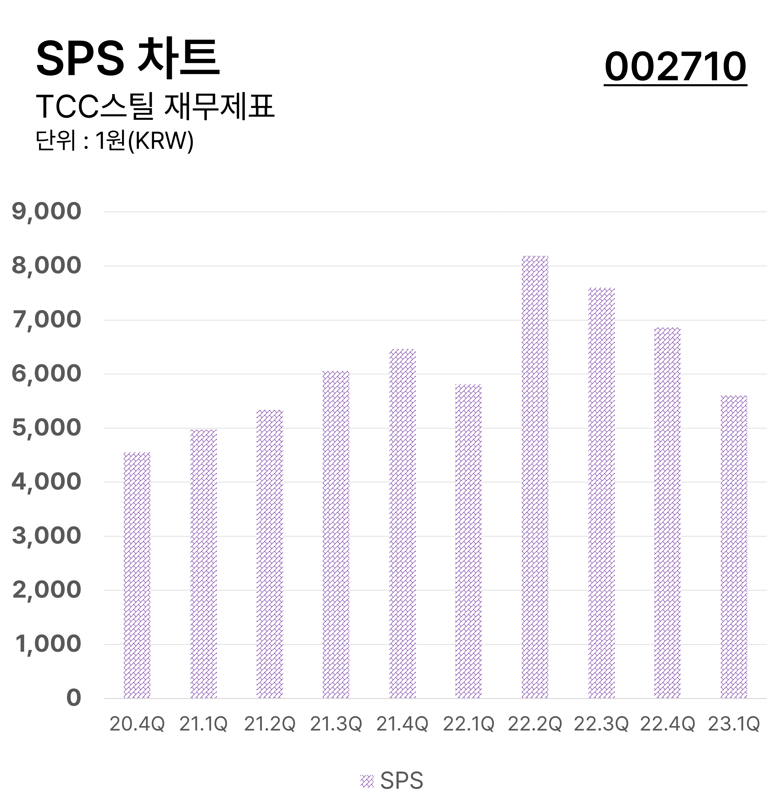 TCC์คํธ์ ๋ถ๊ธฐ๋ณ SPS ์ฐจํธ์ ๋๋ค. ์ฃผ๋น๋งค์ถ์ก(SPS)์ ๋งค์ถ์ก์ ์ ์ฒด ๋ฐํ ์ฃผ์ ์๋ก ๋๋ ์งํ์ด๋ฉฐ ์ฝ๊ฒ ๋งํด์ ์ฃผ์ 1์ฃผ๋น ๊ธฐ์ ์ ๋งค์ถ์ก์ ๊ณ์ฐํ ์งํ์ ๋๋ค.